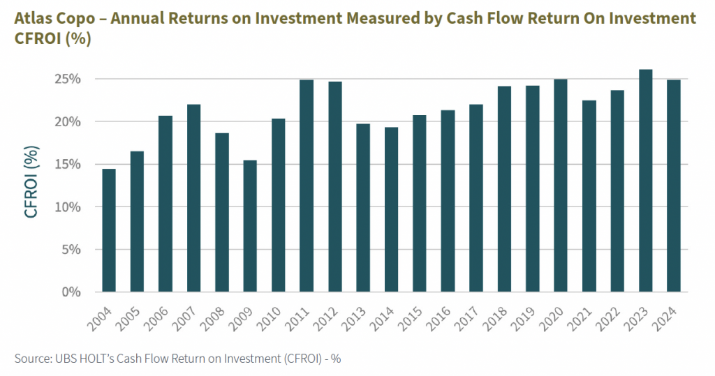 This month we highlight Atlas Copco, a Swedish industrial group that designs, manufactures and services gas compressors, vacuum pumps and other industrial equipment. Founded in 1873, the company has a long track record of attractive returns on invested capital. The chart below, spanning 20 years, illustrates annual returns on invested capital as measured by Cash Flow Return On Investment (CFROI).