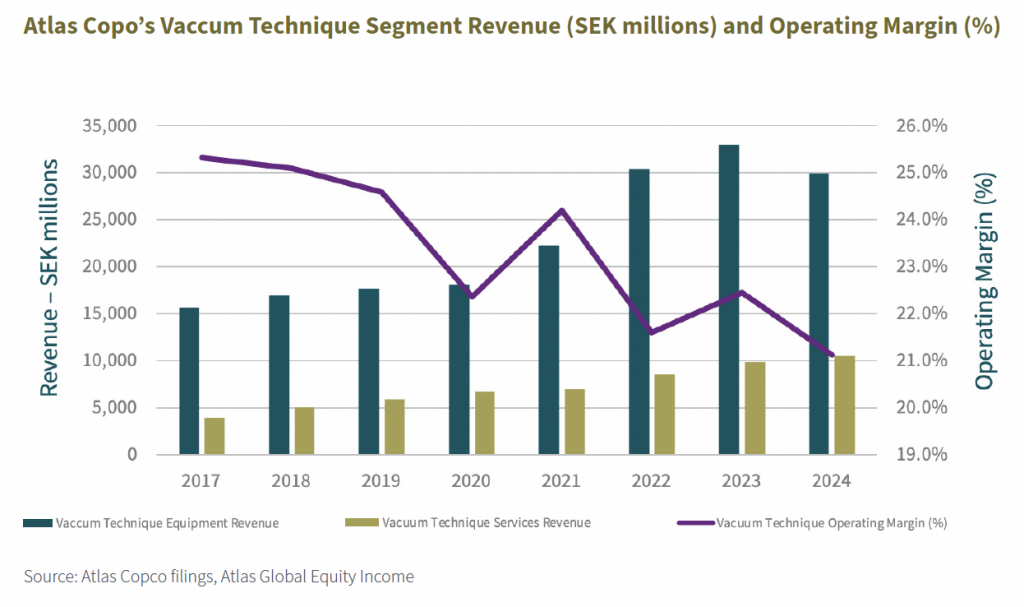 With new fabs opening across the US, Europe, Japan and Taiwan – and AI-driven demand pushing leading-edge capacity additions far into the 2030s – Edwards is well placed to benefit from a multiyear growth tailwind. The subsidiary is reported within Atlas Copco’s Vacuum Technique segment. As shown in the chart below, Equipment revenue for the Vacuum segment has approximately doubled between 2017 and 2024, with most of that growth coming during the global semiconductor shortage that started in 2020. After significant growth, the segment’s exposure to the cyclicality of the semiconductor sector can be seen in 2024 as Equipment sales fell by 9.2%. However, note the steady increase in Services revenue in 2024, despite the downturn. As of FY24, only 26% of segment revenue is from Services, with 74% from Equipment sales – offering significant opportunity for Services revenue to grow in the future.