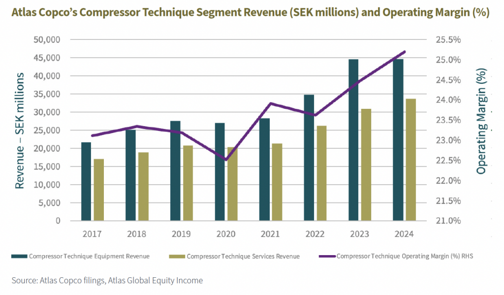 As illustrated in the chart below, the Compressor Technique segment’s revenue is split between Equipment (57% of segment revenue) and Services (43% of segment revenue). The stabilising effect of Services revenue can be seen between 2023 and 2024, when Equipment revenue showed no growth but Services revenue grew 9% year on year. The more compressor units that are installed globally, the more servicing that is required. Also noteworthy is how Atlas Copco has managed to improve the operating margin of the segment to 25.2% in FY24 from 23.1% in 2017.
