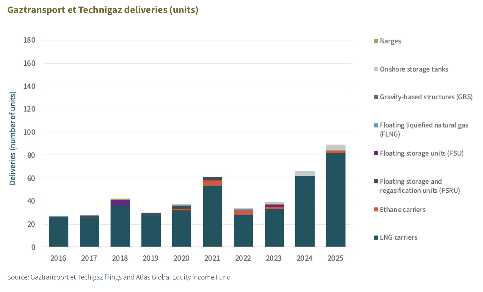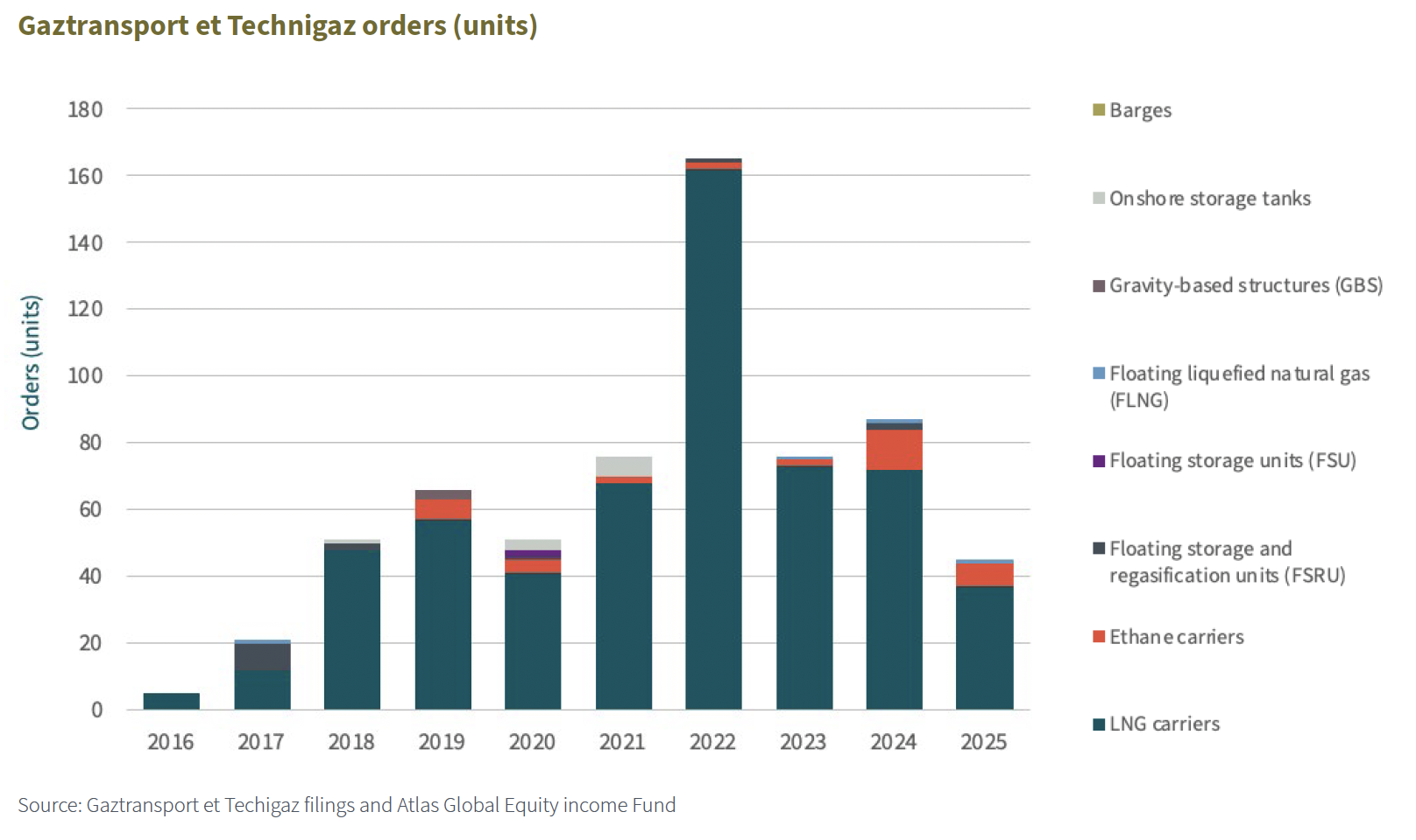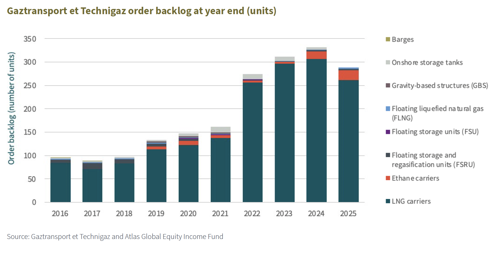 The chart below shows the number of orders delivered (or completed) each year. It indicates the number of vessels (e.g. LNG tankers, ethane carriers, etc) incorporating GTT’s technology which shipyards have officially completed, tested and handed over to their ship-owner customers. FY25 was a record year in terms of deliveries.