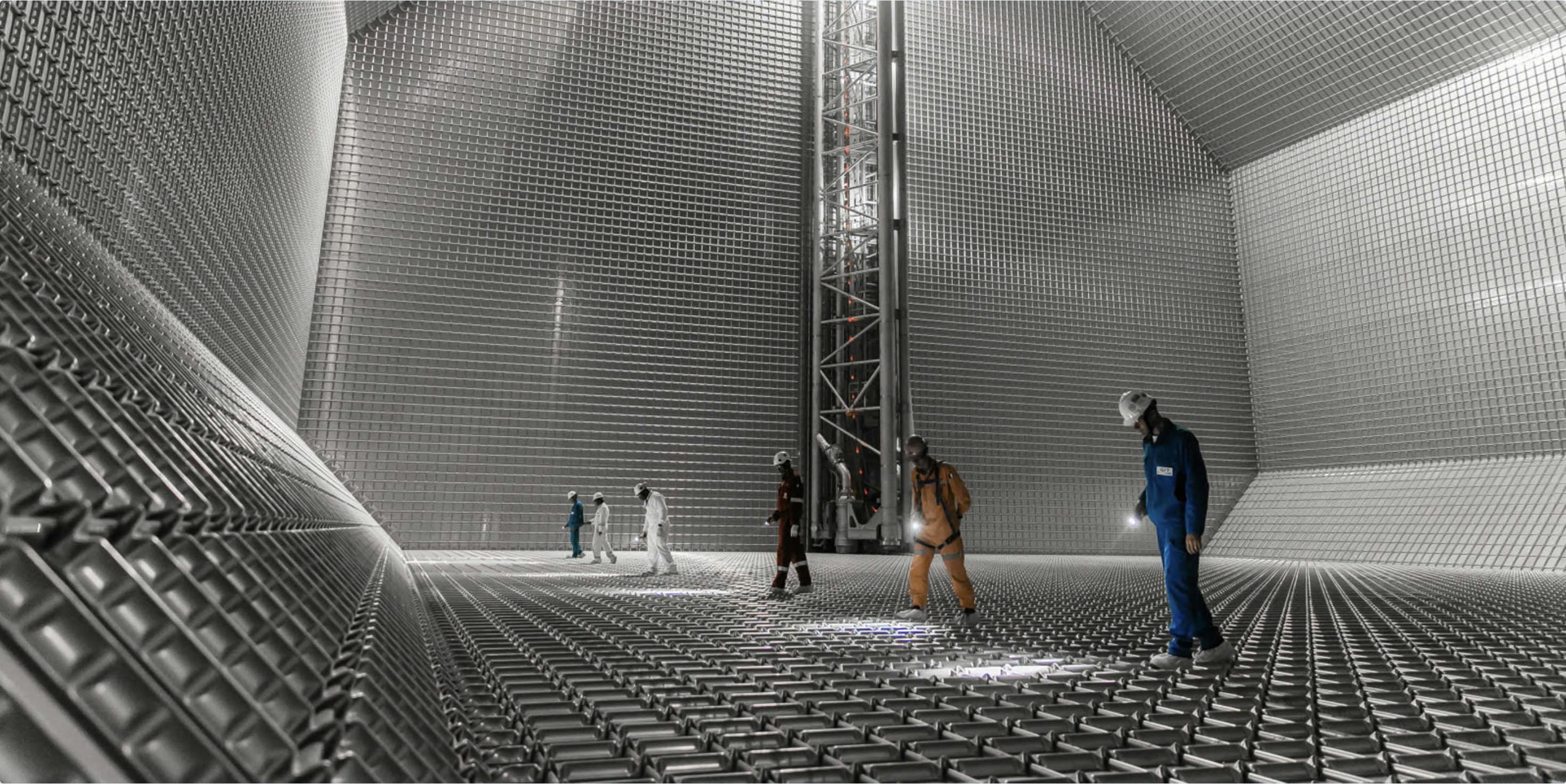 The inside of an LNG tanker once the primary stainless-steel membrane has been installed. Image: © Roland Mouron – GTT